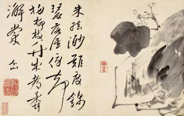 這部冊頁比《傳䋜寫生冊》的創作時間晚二十五年,在此期間作品面貌已有瞭很大轉變 :已從明代寫意花卉的范式中逐漸演變出自我的形式特點,筆墨較舒朗,筆跡介於剛硬含蓄之間,但以中鋒平直線較為多見,起伏頓挫之筆已逐漸隱卻;而物像造型也不再拘謹於前朝畫范,逐漸簡括甚至誇張,有些作品抒情直寫以致體貌超於物形之外,漸趨形成較典型的個人風格。